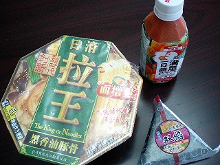 ↑ラ王とセブンイレブンのおにぎりとカゴメの野菜ジュースで昼食です。
