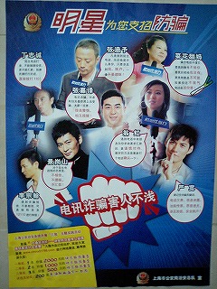 中国のスターたちがいろいろな詐欺について注意しているポスター。