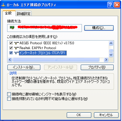③インターネットプロトコル(TCP/IP)を選択 → プロパティ