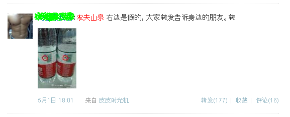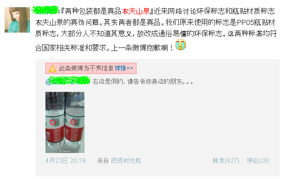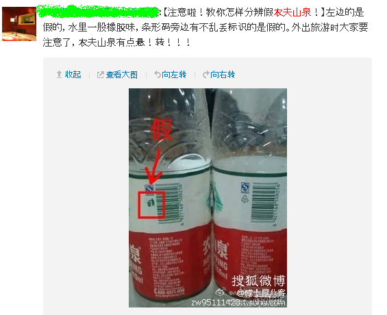 先月下旬、微博で、ミネラルウォーターの「农夫山泉(農夫山泉)」にニセモノがあるという話題が広まりました。