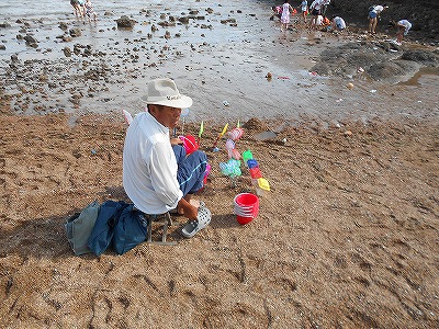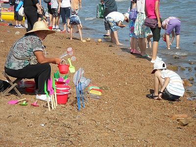 波打ち際ギリギリで磯遊び用グッズを売る人達
