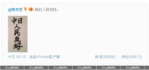 ↑「尖閣諸島は中国のもの、蒼井そらはみんなのもの」で有名な蒼井そらが微博で発したメッセージ。