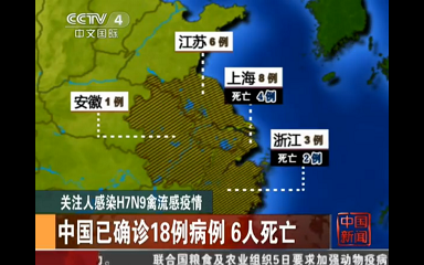 全国报告18例人感染H7N9禽流感确诊病例 6人死亡 (中国語)