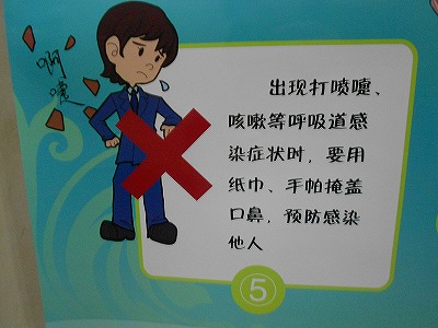 ↑くしゃみをするときは口をティッシュやハンカチで隠すようにと書かれたすばらしい内容。
