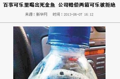百事可乐里喝出死金鱼 公司赔偿两箱可乐被拒绝 (中国語)