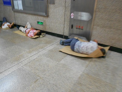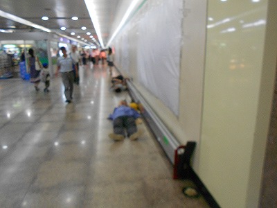スーパーの店内でゴザを敷いているのはまだ見たことがないですが、地下鉄構内で敷いているのは見たことがあります。