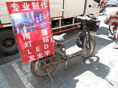 ↑「専業製作」と書かれた広告を後ろにつけた配線むき出しの電動自転車。