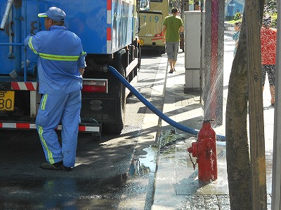 信号待ちをしていたら、横断歩道の近くで散水車が給水していました。