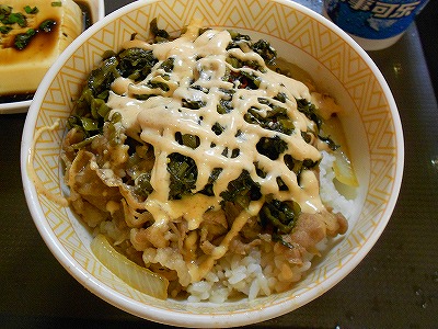 日本語にすると「ピリ辛高菜マヨネーズ牛丼」といったところでしょうか。