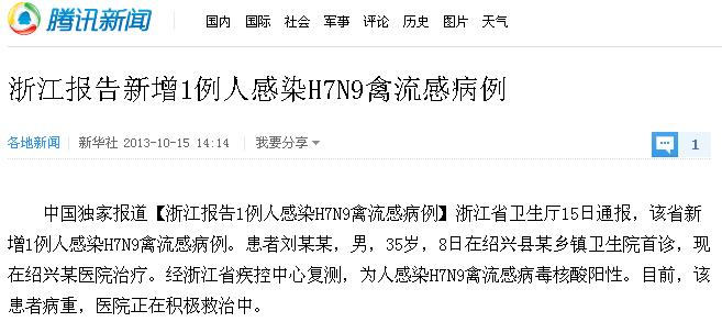 2013年10月15日、浙江省衛生庁は、新たに1例のH7N9型鳥インフルエンザの感染例を確認したと発表した。