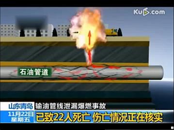 青島市政府の発表によると、22日未明に中国石油化工(シノペック)関係会社の石油パイプラインが破裂し、路面1000平方メートルの広範囲にわたり石油が漏れた。石油は下水管を通じて膠州湾に流出し、海面にも3000平方メートルにわたって広がった。22日午前10時半(日本時間同11時半)ごろ、地下と海面で爆発が起きたが、漏れ出した石油が、ガスと混ざるなどして引火し、爆発したとみられる。