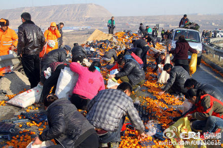 中国の青蘭高速道路(青島~蘭州)の柳溝河料金所付近で4日、みかんを積んだトラック2台が相次いで横転し、近くの村民が散らばったみかんを奪い去ろうとしたところ、これを阻止しようとした警察官が村民らに拳銃を向けるという騒ぎがあった。