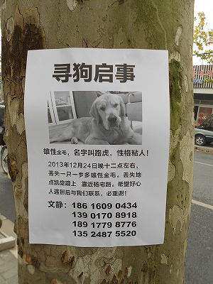↑上海市内に貼られている「犬を探しています」の貼り紙。
