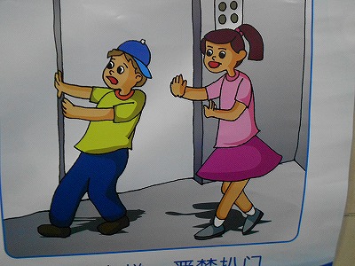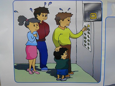 ひその場合の脱出方法ですが、エレベターの籠には二重に安全装置が付いているから落ちることはありません。(安全です)。天井に脱出口がありますから、飛びついて脱出口の蓋を外します。外すとリミットにより籠はその場所から絶対に動きません。その脱出口から籠の外に出てドア(内と外の二重になっています。)を力を込めて開けます。そうすると途中であっても、どちらかの階に脱出できますね。