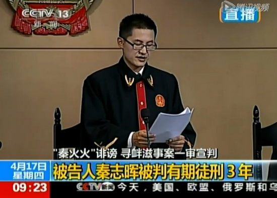 中国北京市朝陽区の裁判所は17日、インターネットで政府機関や著名人を中傷するデマを流したなどとして、誹謗(ひぼう)と騒動挑発の罪で起訴された著名ブロガー、秦志暉(ハンドルネーム秦火火)氏に対し、懲役3年の実刑判決を言い渡した。