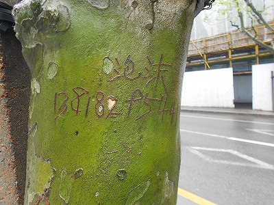 上海の街路樹には、釘か何かで傷つけて書いている文字をよく見かけます。