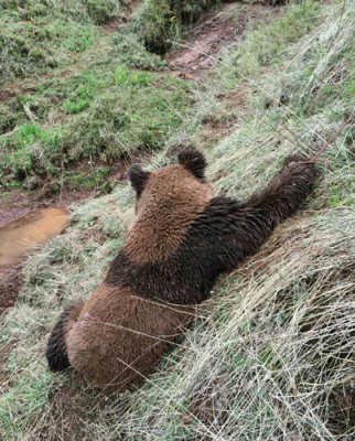 凉山州昭覚県宜牧地郷の住民が7日、地面で転がって泥だらけになって遊ぶ1頭のパンダを発見した。