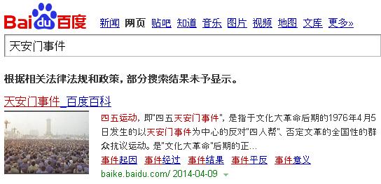 ↑百度で「天安門事件」と検索すると、「法律及び政策によって一部の検索結果しか表示できません」的なことを返されます。
