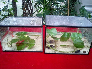 ↑赤いザリガニと青いザリガニ。