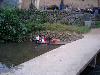 土楼の前の川で洗濯する人たち。