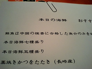 ↑本日のおすすめの紙に「鮮魚は中国の検査に合格した魚介のみを…」
