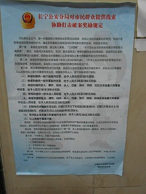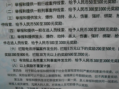 放火や爆弾テロ、殺人犯、強姦などの犯人を見つけてくれたら500元から3000元という奨励金が支払われる模様。