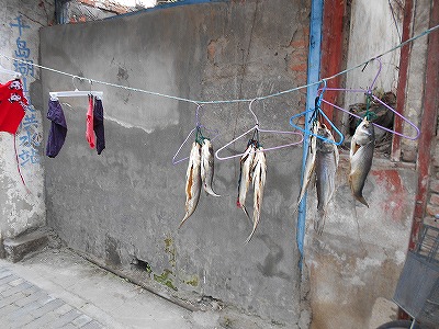 魚を2匹つるすことによってバランスを保っているという匠の技が光る干し方です。