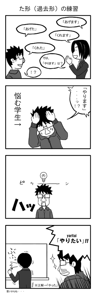ほかにも「て形」とか「ない形」など、動詞の変形を叩き込むわけですが、予習してこないと厳しいんですよね。。。
