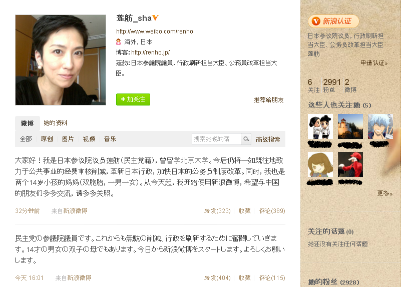 そんな新浪微博のVIPアカウントに民主党の蓮舫氏の名前がありました。