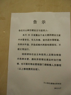 25日にどこかの部屋の水道管が破裂して水浸しになった模様。