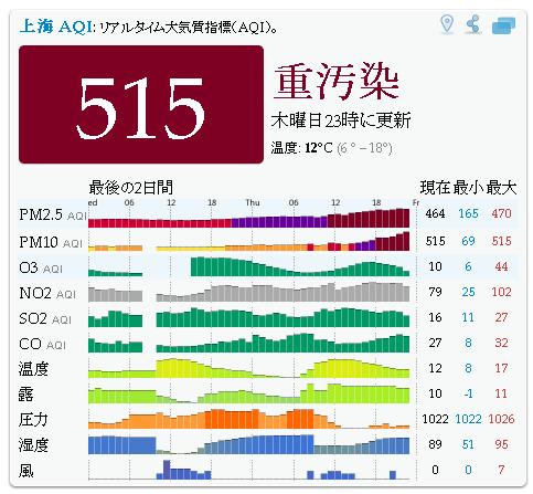 というわけで、大気汚染指数が500を超えて、ソフトじゃ表示できなくなって(メーターを振り切っちゃって)「爆表」なんて表示が出るくらい空気が汚い2013年12月6日の上海。