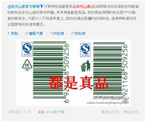 先月下旬、微博で、ミネラルウォーターの「农夫山泉(農夫山泉)」にニセモノがあるという話題が広まりました。