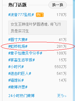 中国のtwitterと呼ばれている微博の注目ワードに「虹桥机场」が上がってきました。