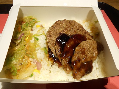 ↑ハンバーガーのパテを半分に切って、なんかのタレがかかっていました。